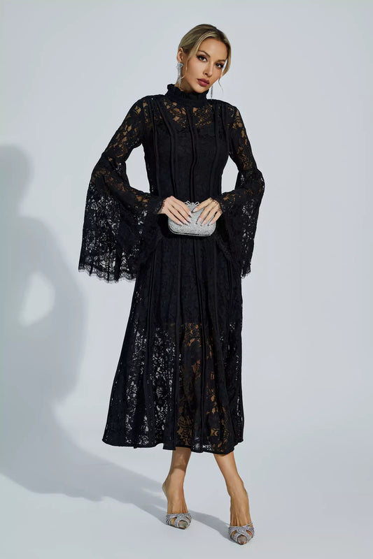 Avah Black Hollow Embroidery Midi Dress