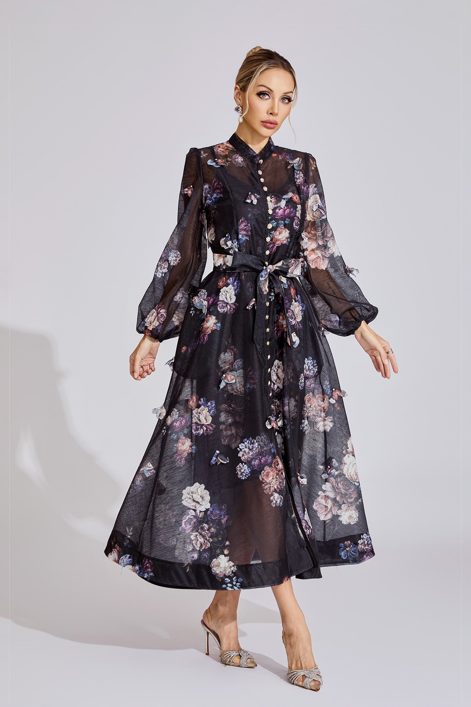 Embrace timeless elegance in this exquisite black printed maxi dress, where delicate floral motifs meet sophisticated design. Crafted from lightweight, semi-sheer chiffon, the dress features a vibrant all-over botanical print, a graceful lantern sleeve, and a flattering A-line silhouette that flows effortlessly with every movement. The front button-fastening adds a touch of classic charm, while the soft, breathable fabric ensures comfort and ease—perfect for autumn gatherings, garden parties, or special occasions where romantic style meets modern wearability.
